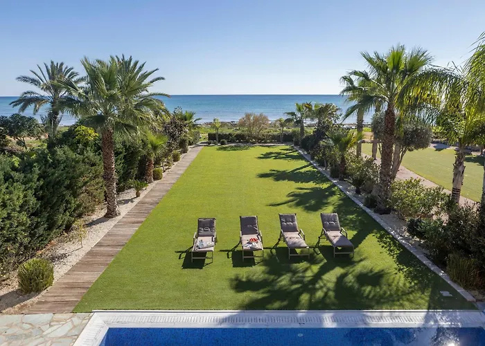 De 3-slaapkamer Ayia Napa Seafront Ionion Villa H5 ligt in de wijk Ayia Thekla in Agia Napa op slechts 150 meter afstand van Liopetri Beach en beschikt over een zwembad en uitzicht op de zee.